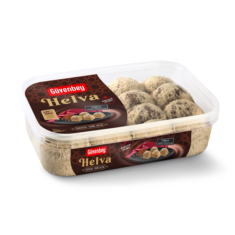 Sizin için dilimlediğimiz Güvenbey Kakaolu Tahin Helva ile çay keyfinizi tamamlayın! Kalite malzeme kullanılarak ve geleneksel yöntemler ile üretilen ve sadece tahin, şeker, kakao ve susam yağının şeker ile karışmasını sağlayan Çöven Özütü kullanılarak yapılmaktadır. 350g, 600g, 800g ve 5000g olmak üzere geniş ürün yelpazesi sunabilirken, baklava dilim, üçgen dilim, tepsi ve blok seçenekleri ile size dilediğiniz kolaylığı sağlamaktadır.