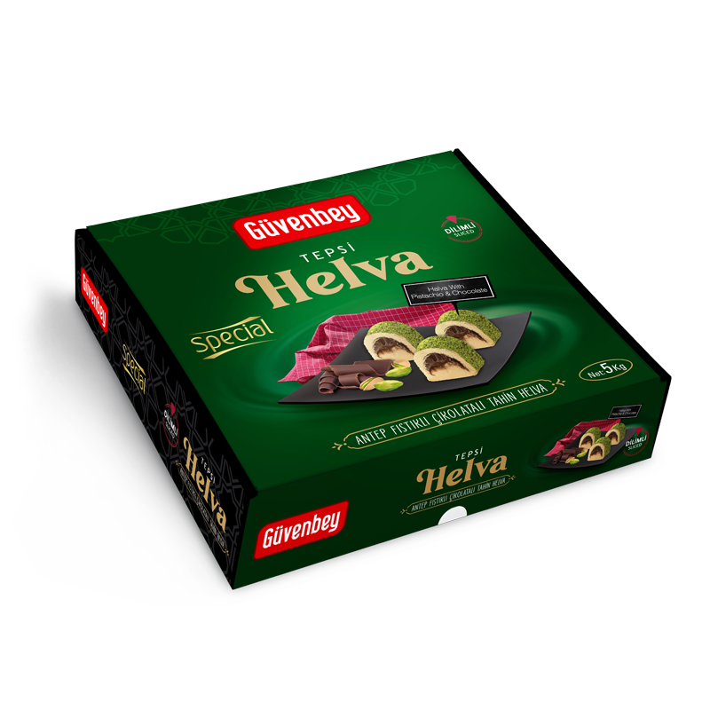 En iyi şeflerin işletmelerinde tercih ettiği dışı bol bol Antep Fıstığı, içi dolgun çikolatası ile damak çatlatan lezzet! Güvenbey Antep Fıstıklı Çikolata Dolgulu Tahin Helva sizin tüm isteklerinizi karşılamak için hazırlandı. İşletmelerinde fark yaratmak isteyen en iyi şeflerin tercihi! İçerisinde hiçbir katkı maddesi ve Glikoz şurubu içermeyen Antep Fıstıklı Tahin Helva, sadece kakao, tahin, şeker ve susam yağının şeker ile karışmasını sağlayan Çöven Özütü kullanılarak yapılmaktadır.