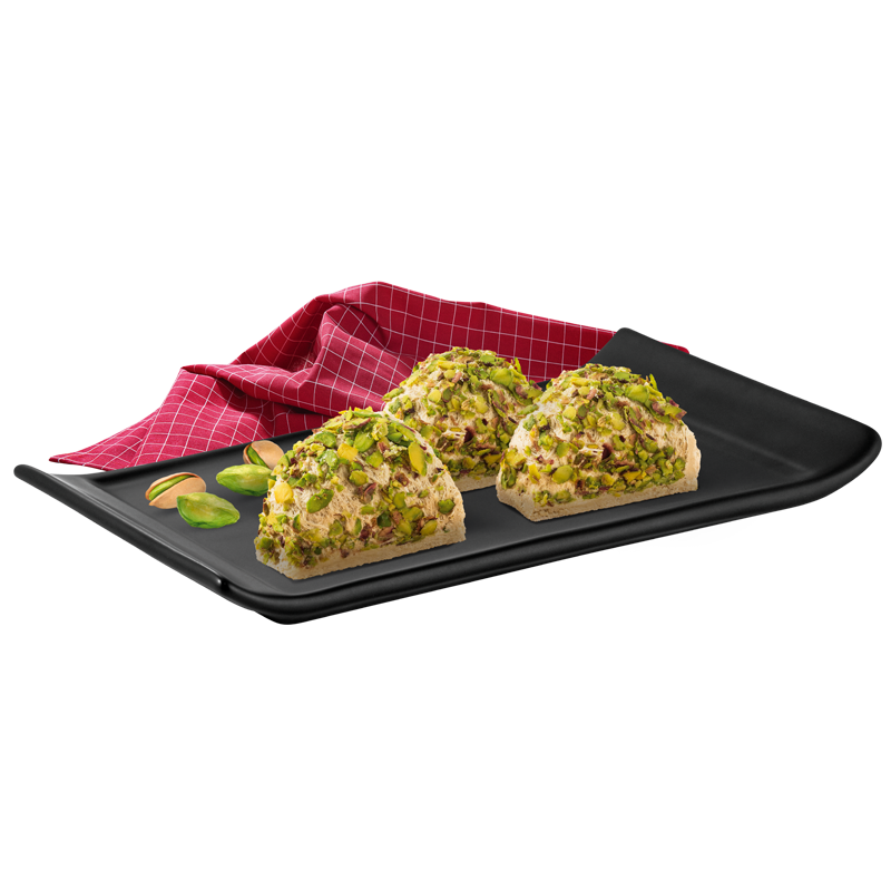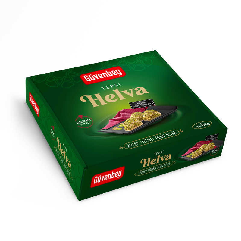 Büyük boyu sayesinde ev dışı tüketim sektöründe maximum performans sağlamak ve zaman kazandırabilmek için dilimli hali ile! En iyi şeflerin tercihi Güvenbey Antep Fıstıklı Tahin Helva 5000g Tepsi hali ile sizlerle! Antep Fıstığı lezzeti ile konuklarınızı şaşırtabilir, üçgen dilimli yapısı ile işletmelerinizde hızlı servis yapabilirsiniz. 1. kalite malzeme kullanılarak ve geleneksel yöntemler ile sadece tahin, şeker ve susam yağının şeker ile karışmasını sağlayan Çöven Özütü kullanılarak yapılmaktadır.